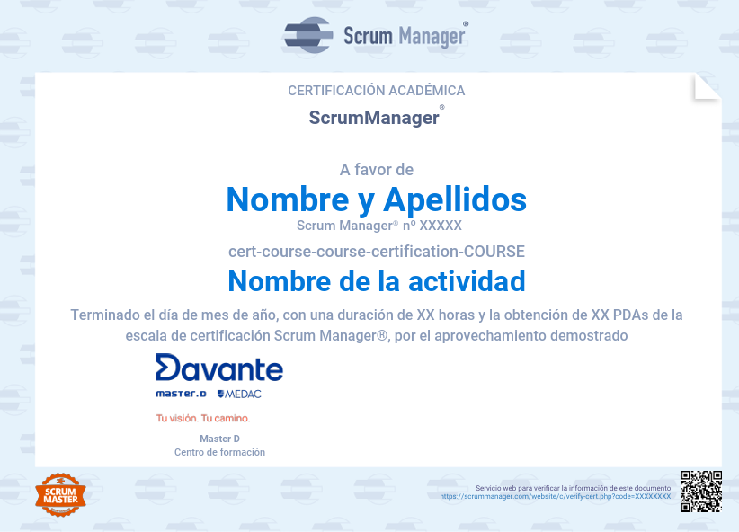 Finalmente, de la mano de Scrum, modelo de desarrollo de proyectos ágiles, una vez superado el examen de certificación correspondiente obtendrás la certificación Scrum Master que te acerca todavía más al mercado laboral.