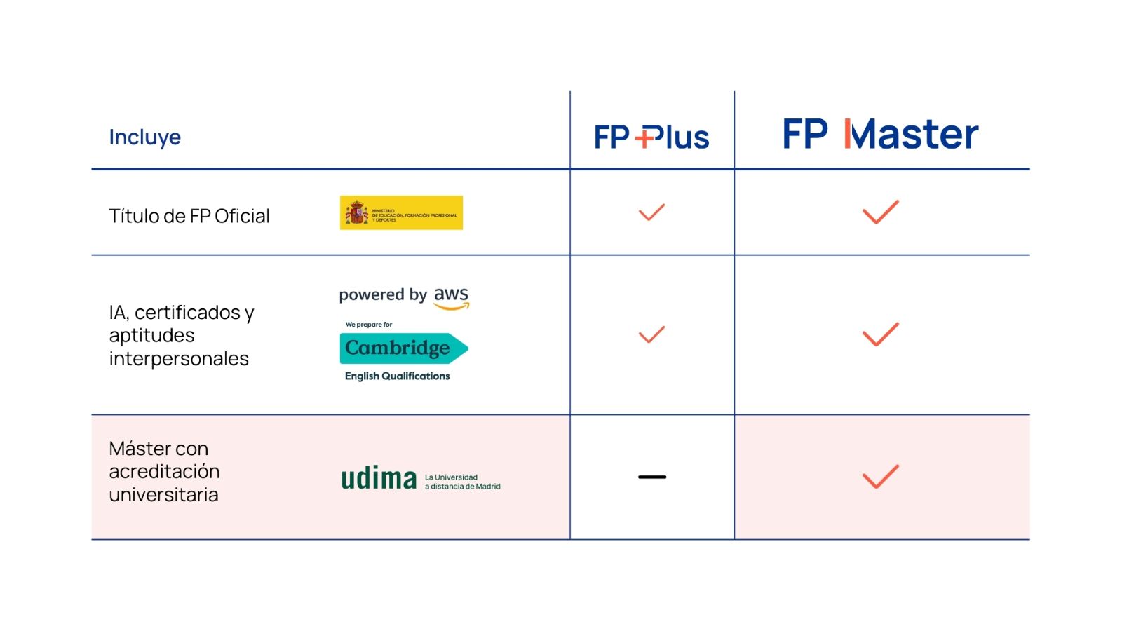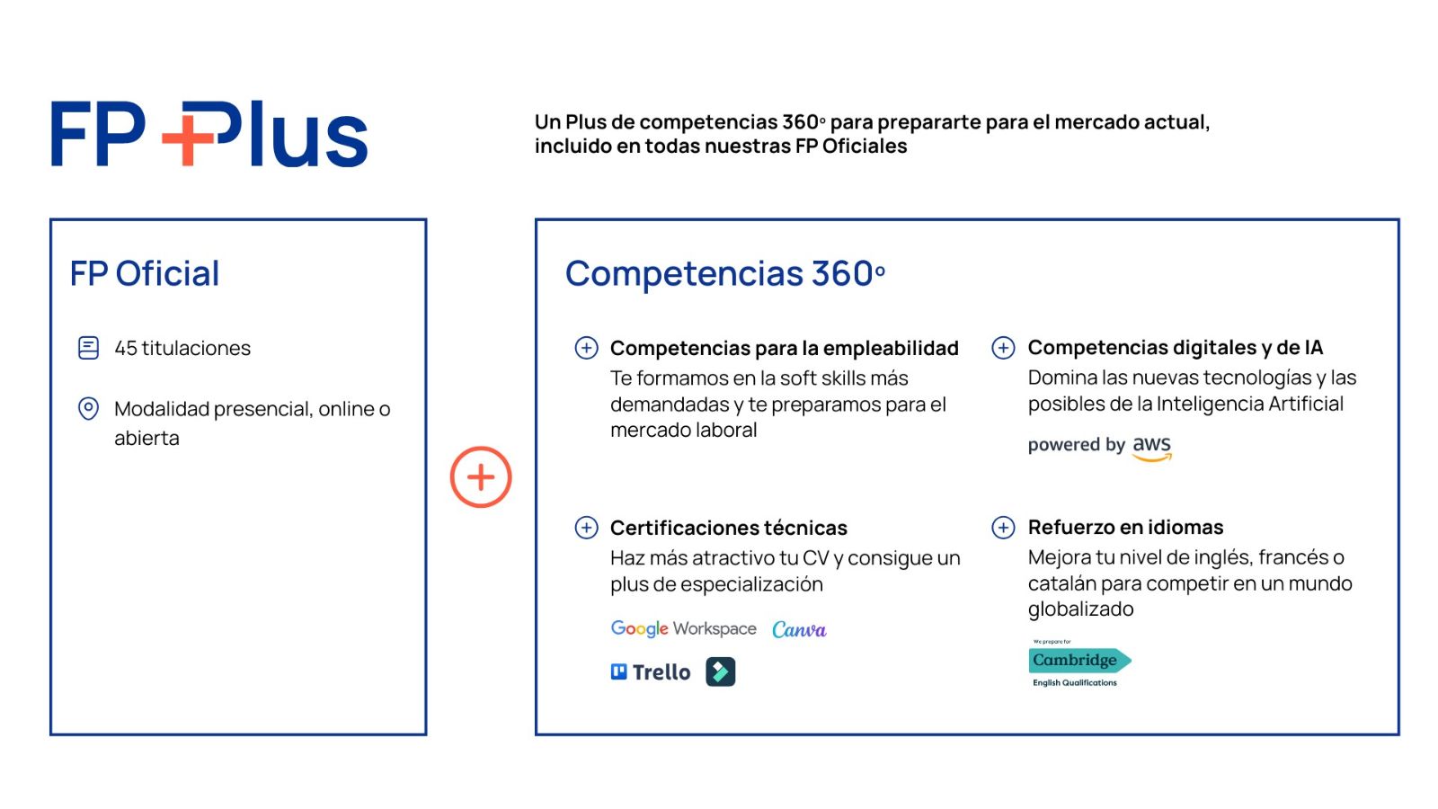 Con nuestra FP Plus, además del título oficial de FP, te prepararás en habilidades y herramientas que son imprescindibles hoy en día en cualquier sector: competencias digitales, idiomas, inteligencia artificial y certificaciones técnicas específicas de tu sector.